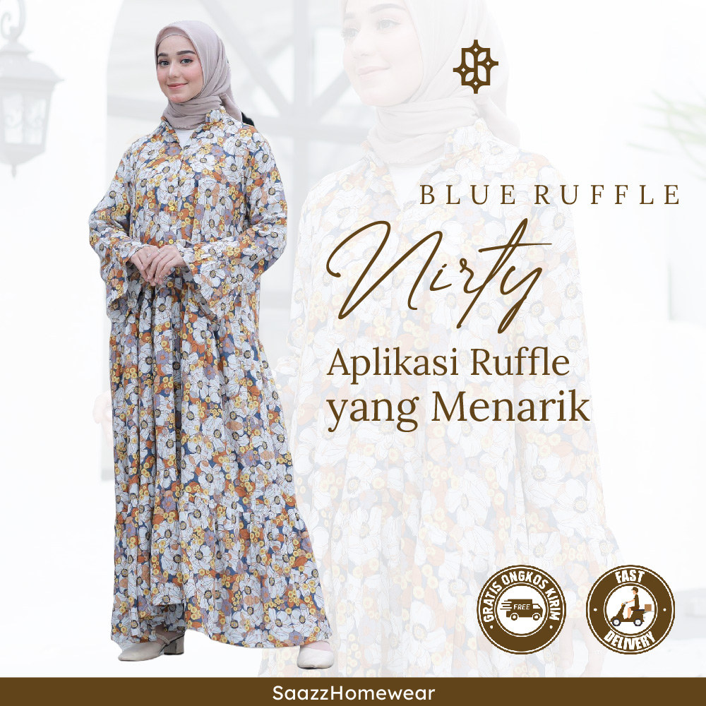 SAAZZ Nirty Blue Ruffle Gamis Bunga Bunga Baju Muslim Wanita Kekinian Terbaru Terlaris