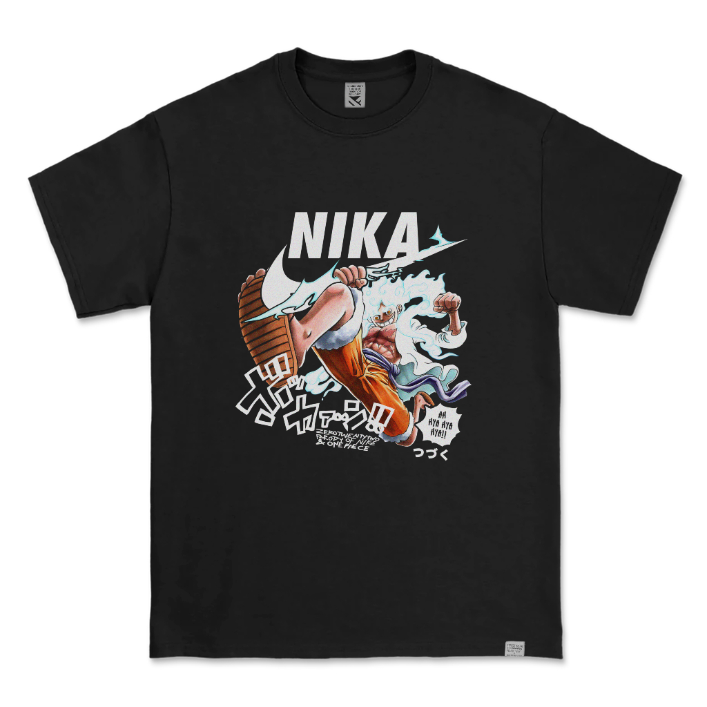 Kaos Distro Parodi ZeroTwentyTwo T-Shirt NIKA Luffy Gear 5th One Piece Black | Baju Pria Lucu Parody Plesetan Anime Manga